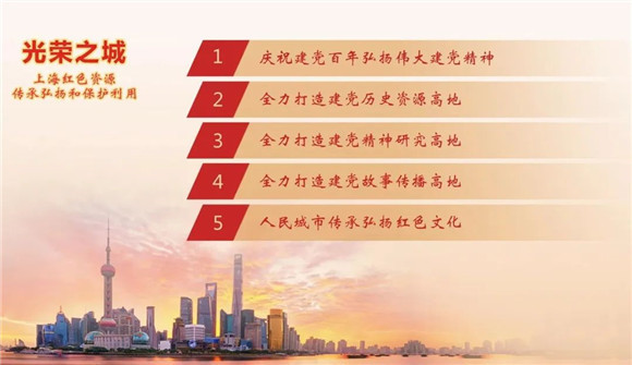 第二部分“全力打造建党历史资源高地”,集中展示上海对重要红色资源的发掘保护和展陈利用工作。如市政府公布《上海市红色资源名录(第一批)》,推动以“一馆五址”为代表的旧址保护利用等工作。