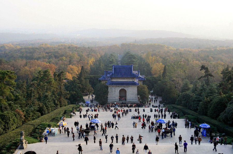 中山陵前临平川,背拥青嶂,东毗灵谷寺,西邻明孝陵,整个建筑群依山势而建,由南往北沿中轴线逐渐升高,主要建筑有博爱坊、墓道、陵门、石阶、碑亭、祭堂和墓室等,排列在一条中轴线上,体现了中国传统建筑的风格,从空中往下看,像一座平卧在绿绒毯上的“自由钟”。融汇中国古代与西方建筑之精华,庄严简朴,别创新格。