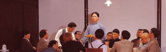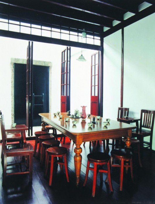 这是一处典型的上海石库门建筑,青墙红砖交错,乌黑木门配一对铜环,院内是一上一下的大开间。李汉俊把一楼的客堂间布置成会场。一个长方形餐桌,十几把圆形椅凳,15名年轻人、包括两个高鼻梁老外,带着兴奋心情齐聚于此。