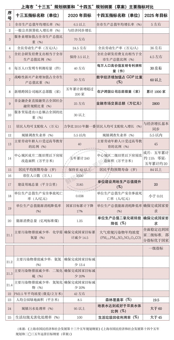提交市十五届人大五次会议审查的《上海市国民经济和社会发展第十四个五年规划和二〇三五年远景目标纲要(草案)》(下称《纲要(草案)》),列出了20项“主要指标”,比“十三五”规划少了5项。